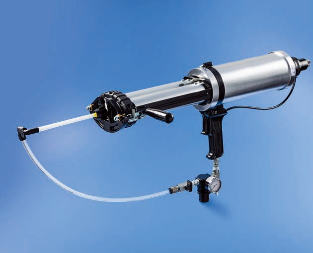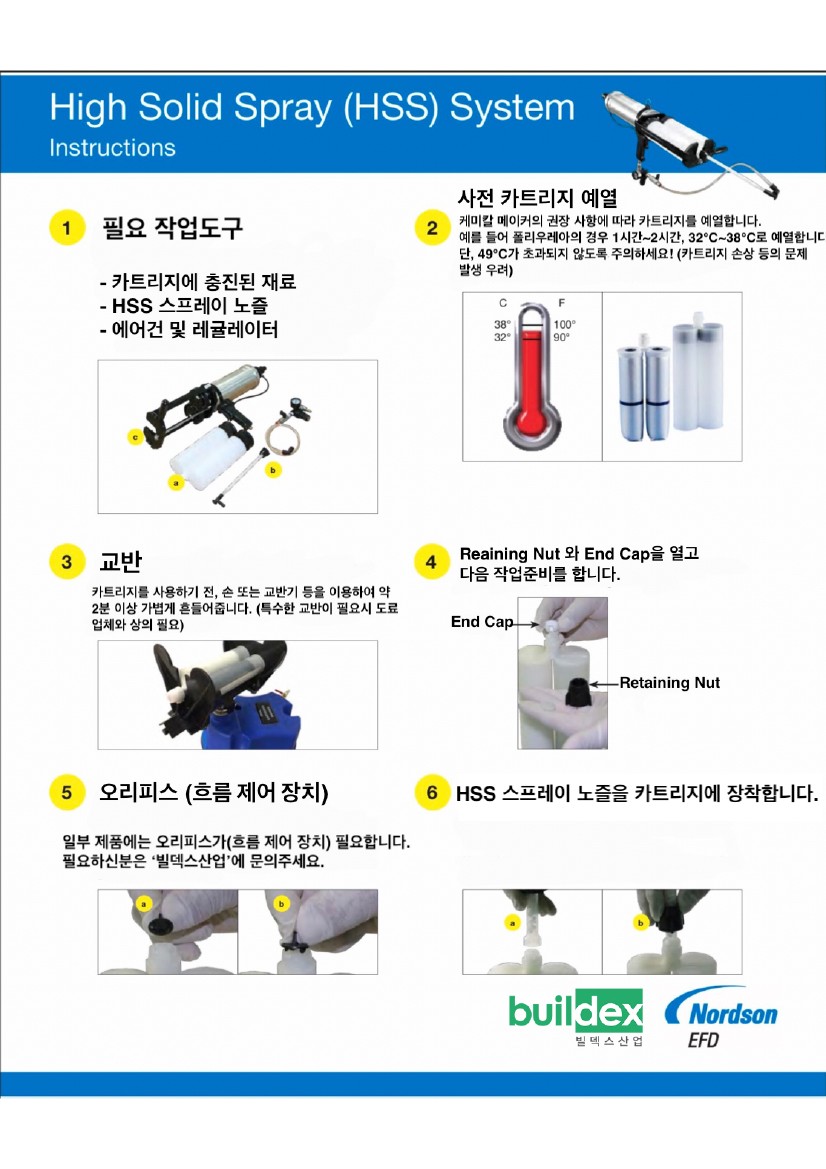 (사진설명)완전히 조립된 HSS 하이 솔리드 스프레이 시스템에는 디스펜스 건, 카트리지, 스프레이 노즐이 있는 믹서 및 조절기 키트가 포함됩니다.